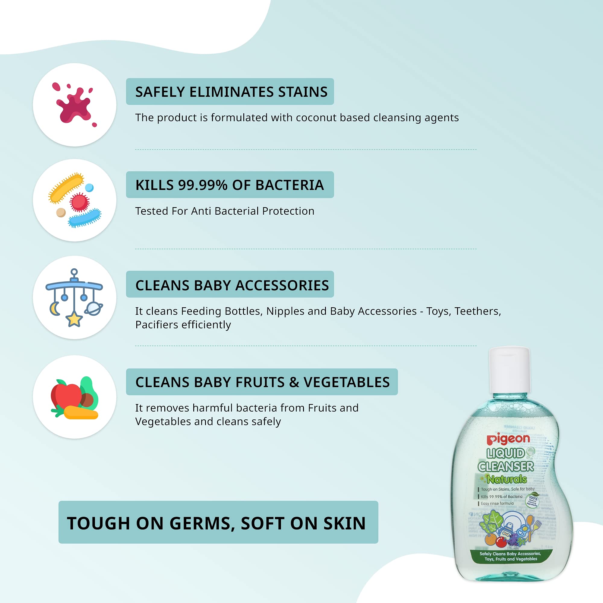 Pigeon Liquid Cleanser is ideal for cleaning feeding bottles, Nipple/Teats, Pacifiers, Feeding Accessories & Toys as well as fruit and vegetables, etc