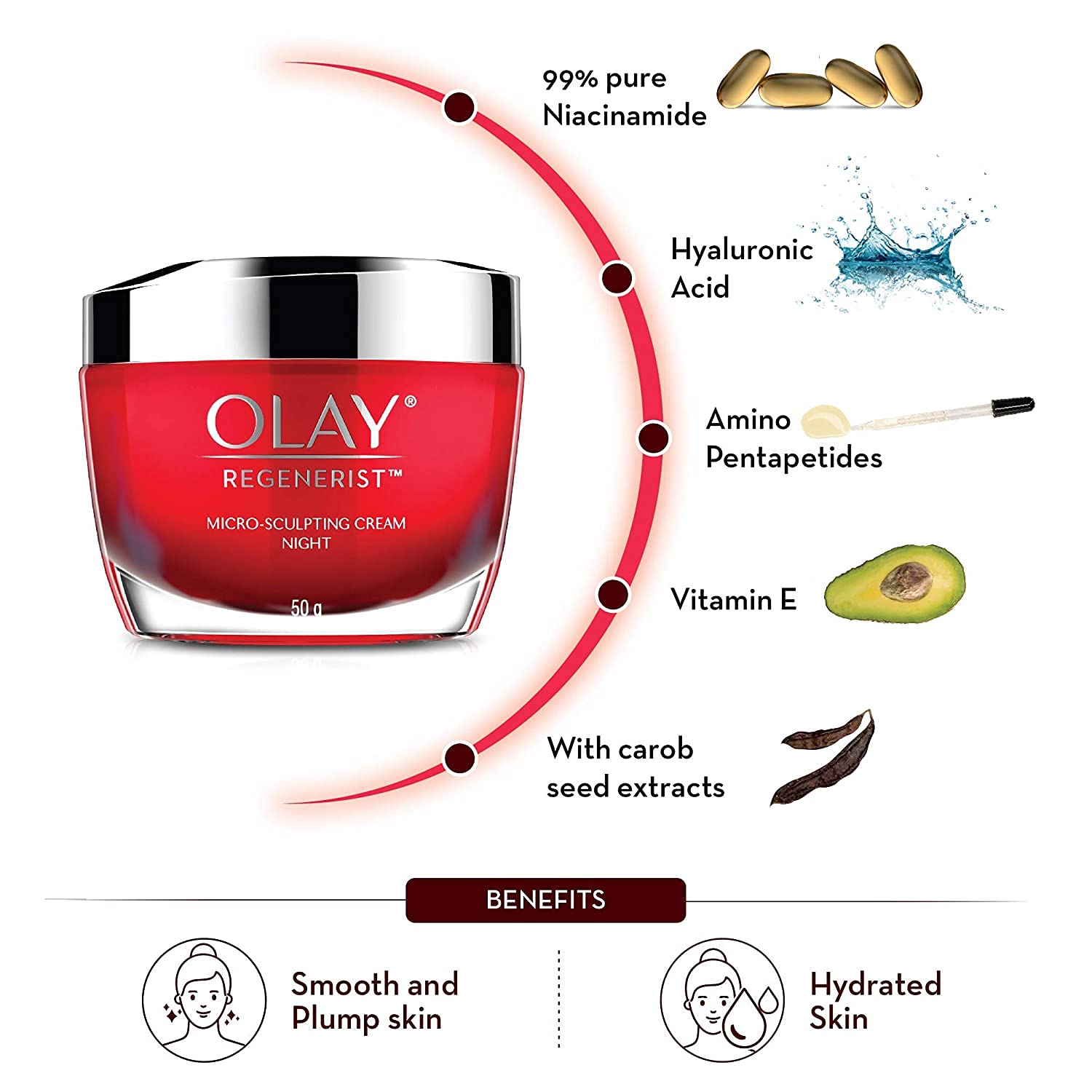 Powehyaluronic acid, vitamin B3, carob seed extracts, amino peptide complex