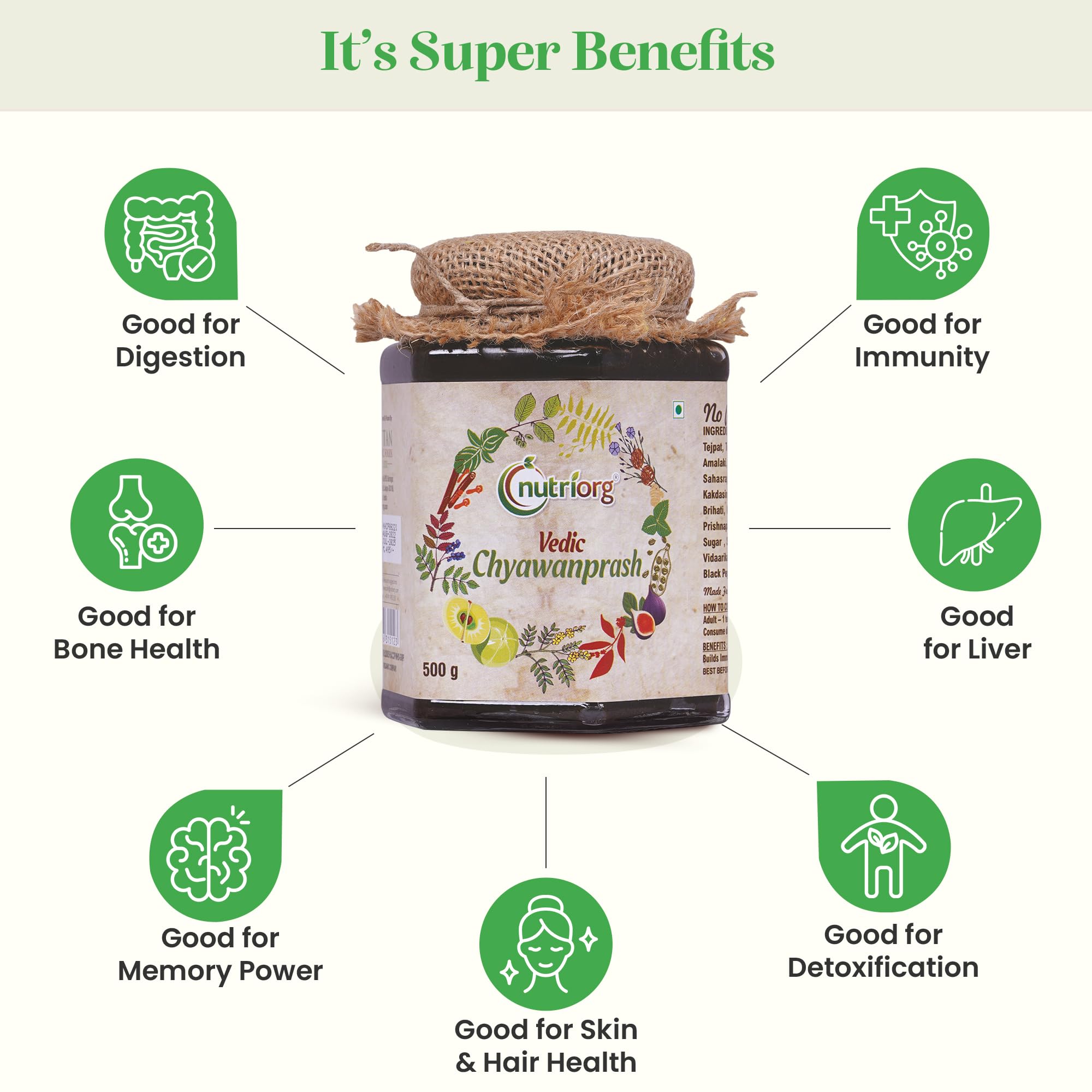 Nutriorg Vedic Chyawanprash is rejuvenating and energizing, as it is rich in Vitamin C. Chyawanprash supports digestion as well as in the absorption of nutrients and is so abundant in nutritional properties that it is known as “The Elixir of Life.â€