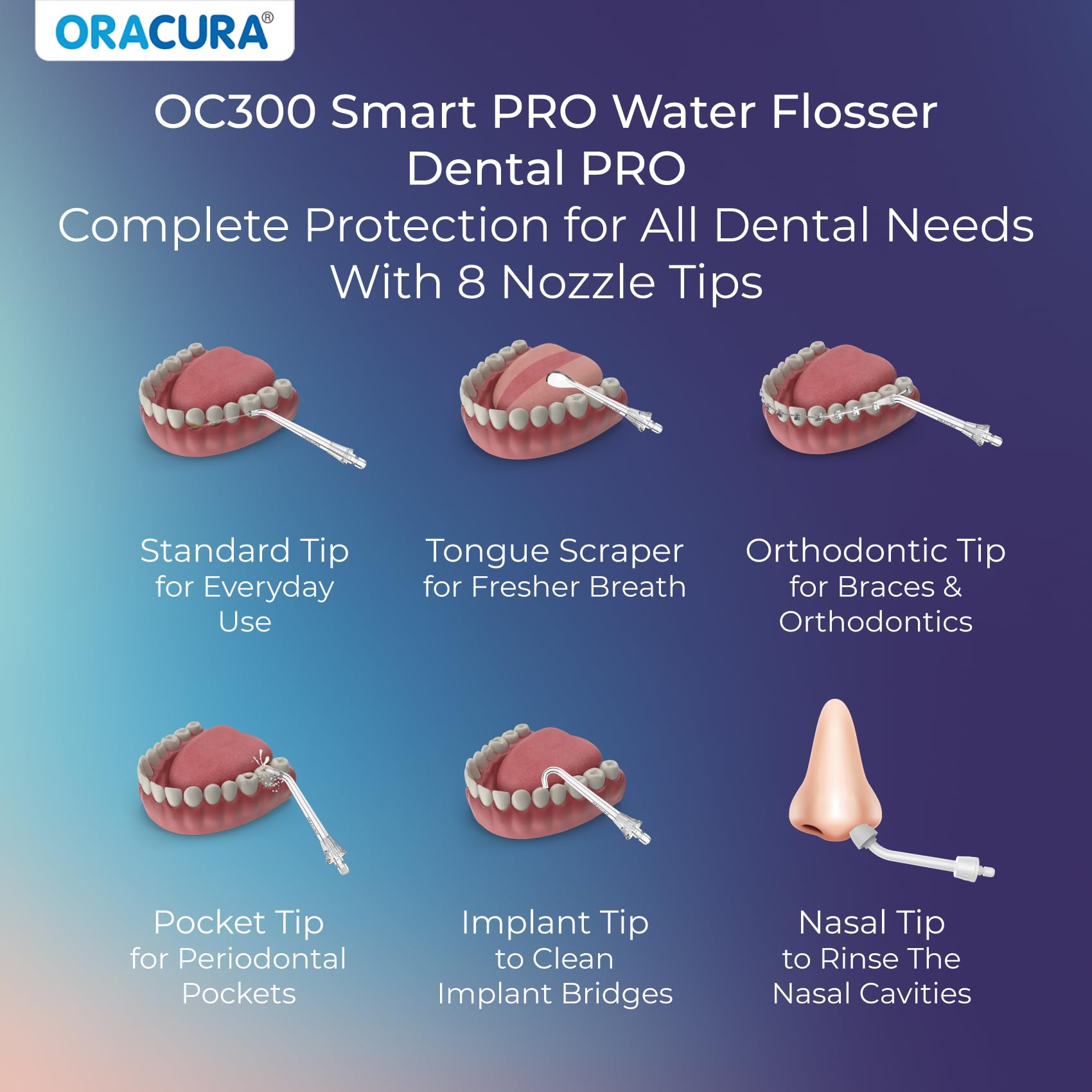 Nozzle Tip Variety: The Dental PRO package includes 8 tips for all dental needs, from Standard Tips to Tongue Scrapers, Orthodontic Tip, Pocket Tip, Implant Tip, and Nasal Tip.