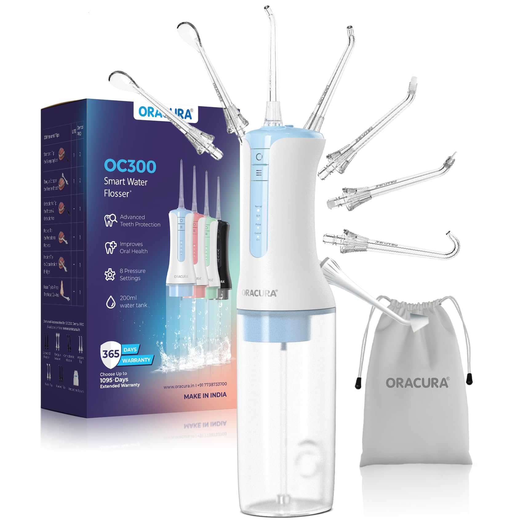 Package Contents: OC300 Smart Pro Water Flosser Main Unit, 300ml Water Tank, Product Carry Pouch, Eight Nozzle Tips (2 Standard Tips, 2 Tongue Scrapers, 1 Orthodontic Tip, 1 Pocket Tip, 1 Implant Tip, 1 Nasal Tip), USB Cable & Operation Manual.