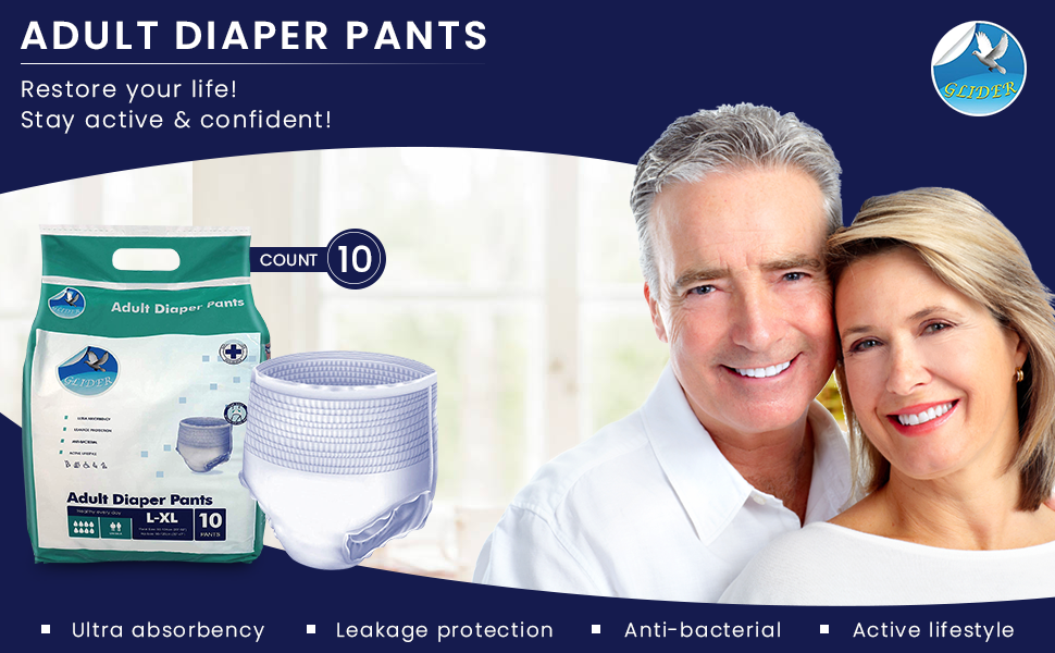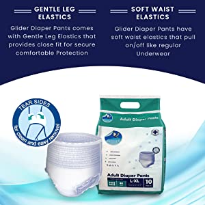 COMFORTABLE AND DISCREET FIT Glider Diaper Pants make sure leaks don't stand in the way of you living your life. Constructed with the softest of materials, thick core padding provides superior absorbency and a plastic exterior to protect you from odors and leaks. |
