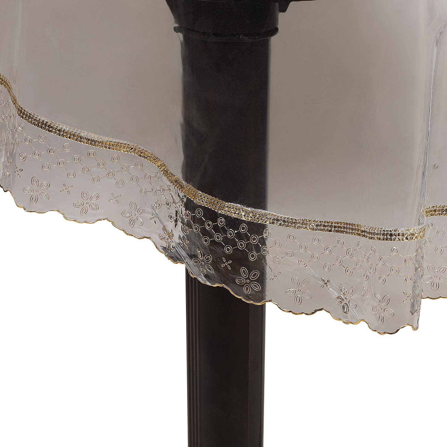 MATERIAL: 0.25 mm Super Transparent Super Soft Imported PVC Sheet, LACE: Embossed Golden Lace Reversible Border, NO JOINT- NO DEFECT-MORE LIFE, One side Golden Lace Other Side Silver Lace Shape: RECTANGLE, OVAL, SQUARE, ROUND